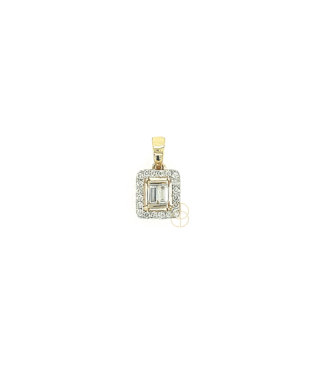 14 krt geelgouden hanger met 2 baguette geslepen diamanten 0.11ct en 20 briljant geslepen diamanten 0.10ct Si/H. Totaal diamantgewicht 0.21ct SI/H. Afmeting ahanger inclusief hangoog: 15 x 7 mm.