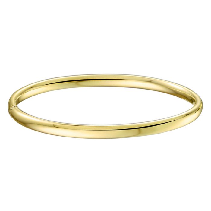 14krt geelgouden bangle armband met een breedte van 4mm. De armband heeft rond afgewerkte randen en een scharnier sluiting. En heeft een kern van massief zilver, waardoor de armband niet deukt.