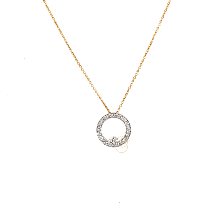 14 krt geelgouden collier met geelgouden hanger met 27 briljant geslepen diamanten, totaal diamantgewicht 0.17ct Si/H. Lengte 45cm, met twee extra tussenogen.