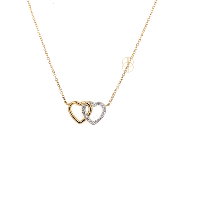 14 krt geelgouden collier met dubbele hart hanger, totaal diamantgewicht 0.06ct Si/H.