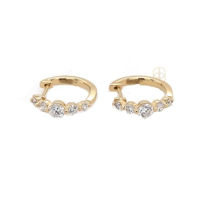 14 krt geelgouden oorringen bezet met 10 briljant geslepen diamanten, in verschillende groottes. Totaal diamantgewicht 0.74ct SI/G. Diameter 16mm, breedte 3,5mm.