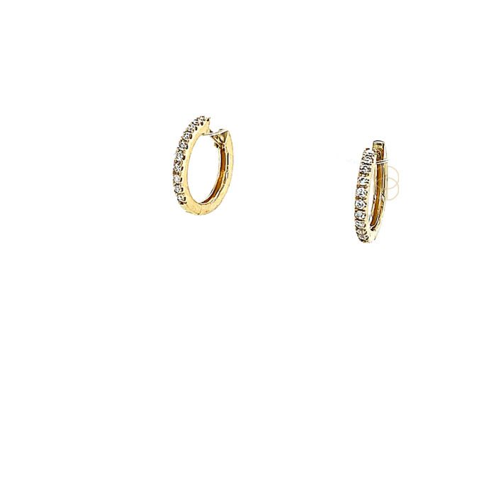 14 krt geelgouden strakke oorringen met briljant geslepen diamanten, totaal diamantgewicht 0.12ct SI/W. Diameter 12mm, breedte 1,5mm.