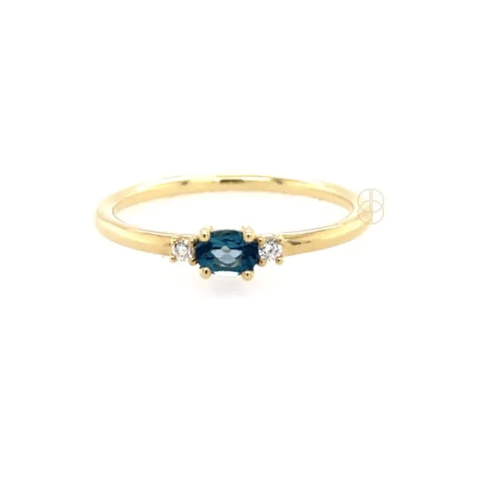 14krt geelgouden ring met ovale london blue topaas midden steen en 2 briljant geslepen diamanten ernaast. Totaal diamantgewicht 0.02ct P1/W.
