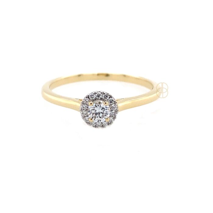 14 krt geelgouden ring met 1 briljant geslepen middensteen van 0.15ct en 14 briljant geslepen diamanten eromheen. Totaal diamantgewicht 0.21ct Si/H.