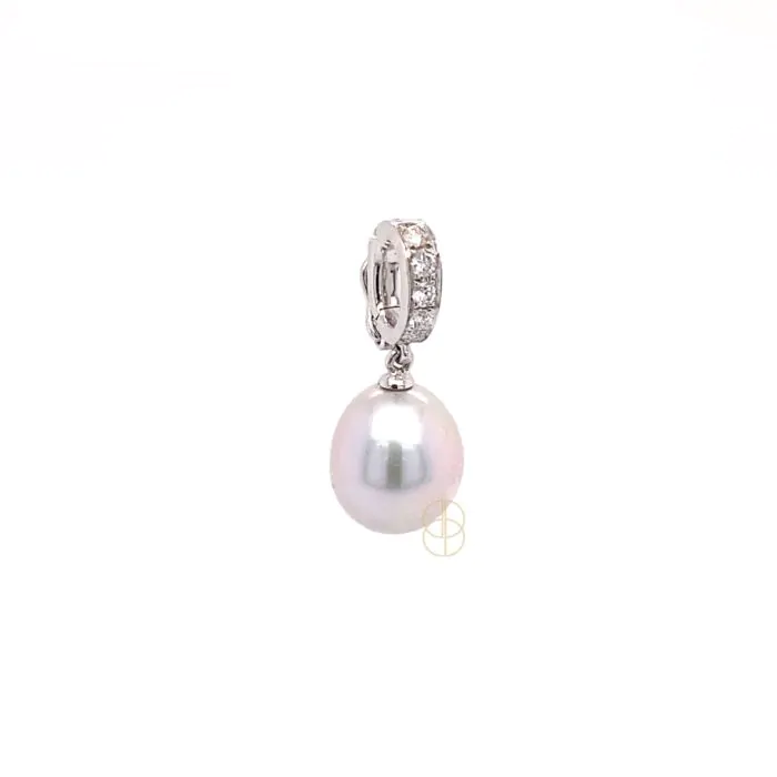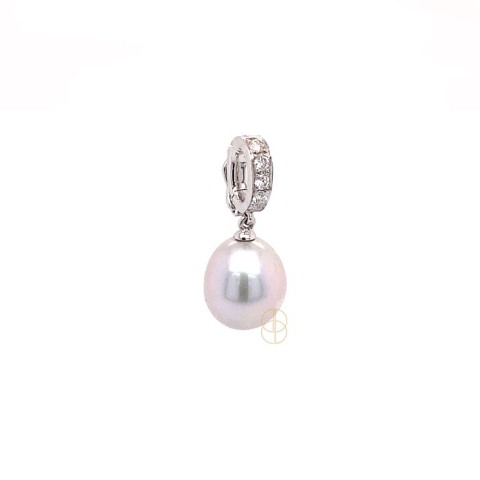 14 krt witgouden cliphanger met een druppelvormige cultivé parel en 5 briljant geslepen diamanten, totaal 0.05ct. Afmeting compleet 20 x 8.5mm