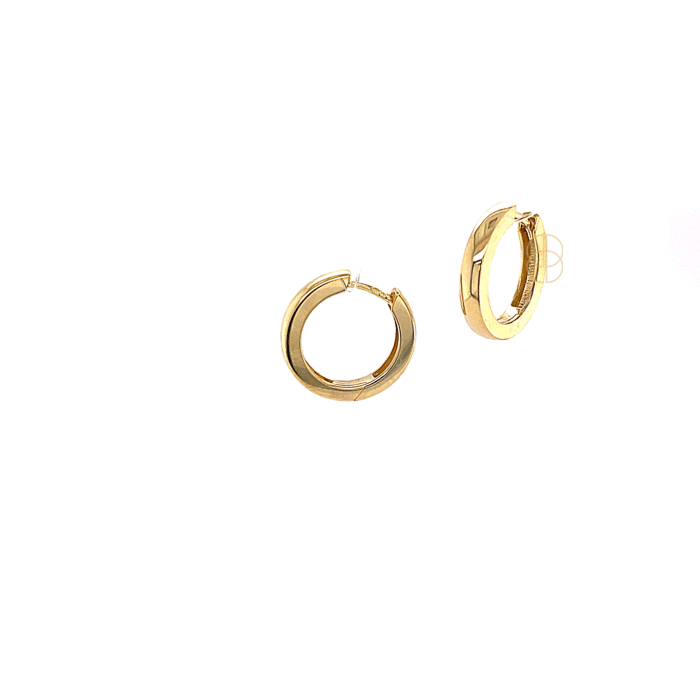 14 krt geelgouden strakke oorringen. Diameter 15,5mm, breedte 2,5mm. Merk: Monzario