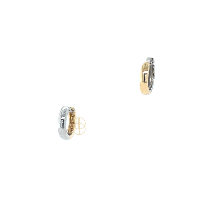 14 krt geel en witgouden strakke oorringen. Voorkant van de oorring is witgoude en achterkant geelgoud. Diameter 12,5mm, breedte 2,5mm.