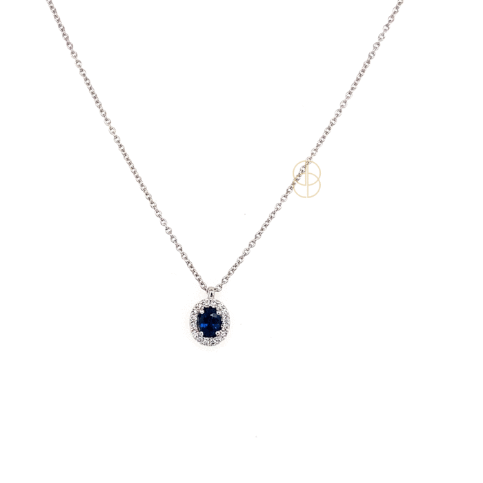 Een 14 krt witgouden entourage hanger met ovaal geslepen blauwe saffier 0.23ct en 16 briljant geslepen diamanten. Totaal diamantgewicht 0.06ct SI/H. Afmeting hanger: 9 x 6 mm.