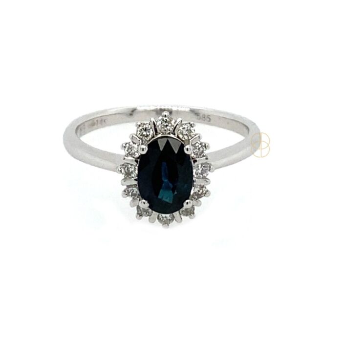 Een 14 krt witgouden entouragering met 1 ovale geslepen Saffier 0.69ct en 10 briljant geslepen diamanten 0.10ct SI/G. Dit model heeft veel bekendheid gekregen door Lady Diana. Merk: Pas Diamonds.