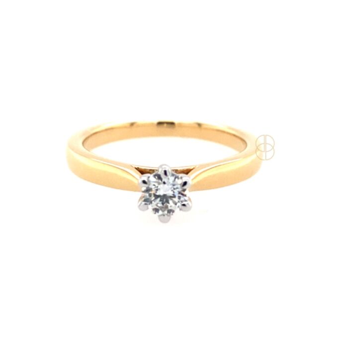 18krt bicolor gouden solitairring met een briljant geslepen diamant van 0.25ct. Kwaliteit VVS/TW. Diverse ringmaten leverbaar.