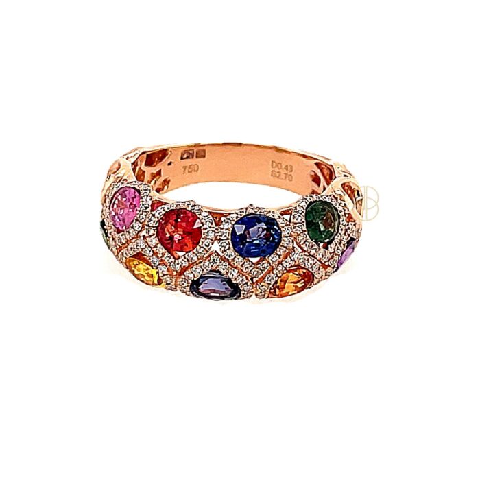 18krt roségouden ring met 158 briljant geslepen diamanten, totaal 0.43ct SI/G en 9 saffieren in regenboogkleuren,totaal 2.70 ct. Breedte van de ring 8,5mm.
