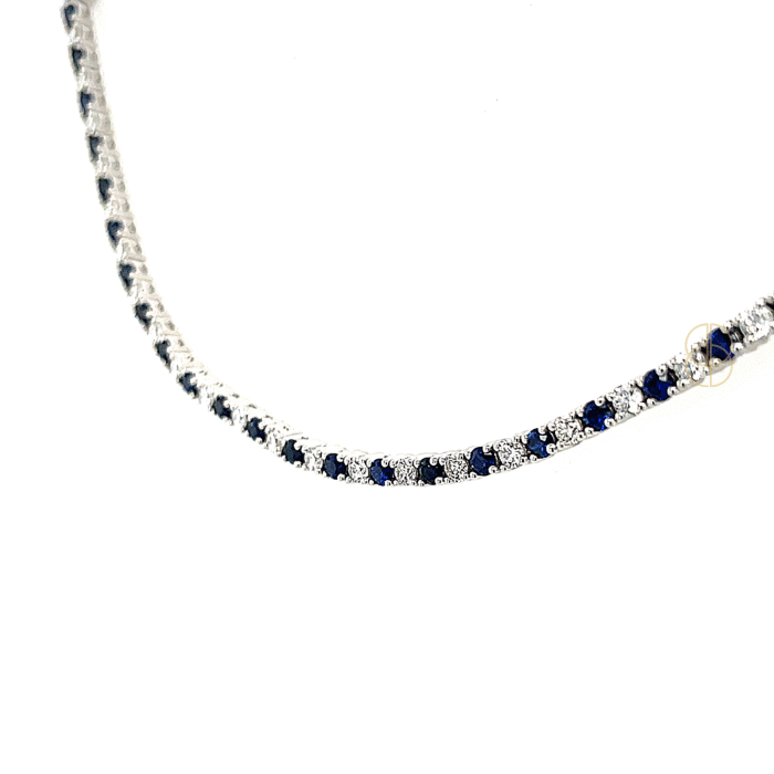 18 krt witgouden tennisarmband met 33 briljant geslepen diamanten 1.52ct Si/G en 33 blauwe saffieren 2.00ct. Lengte 18cm