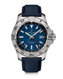 De Avenger Chronograph GMT 45 heeft een stevige roestvrijstalen kast van 44 mm, een zwarte of blauwe wijzerplaat en naar keuze een roestvrijstalen band of een bijpassende leren militaire band.
