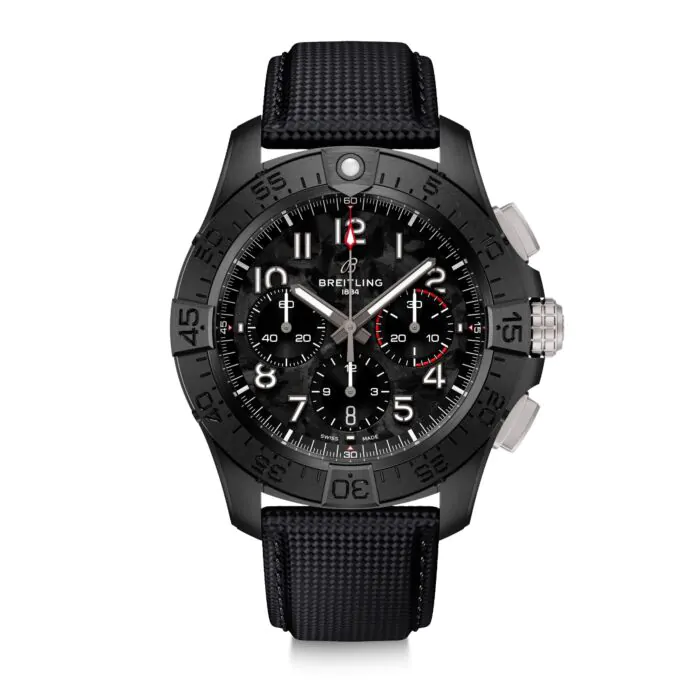 De Avenger Chronograph 44 is de opvolger van de Avenger 3. De kast is van zwarte keramiek en titanium. Het horloge is uitgerust met een Breitling B01 Caliber, een uurwerk met een stopwatch functie. Aan dit horloge zit een military calfskin leren band.