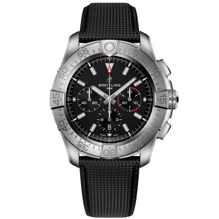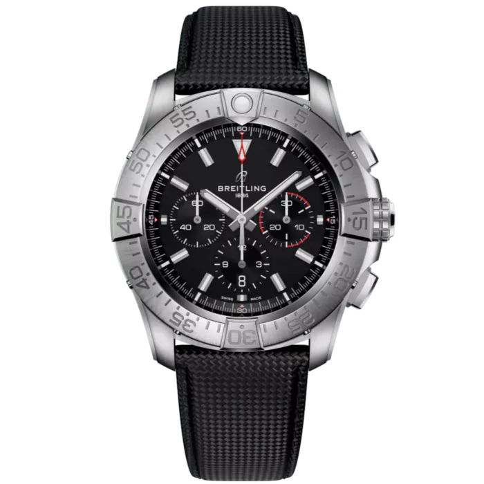 De Avenger Chronograph 46 is een aanvulling van de nieuwe Avengers. Het horloge is uitgerust met een Breitling B01 Caliber, een uurwerk met een stopwatch functie. Aan dit horloge zit een titanium of een military calfskin leren band.