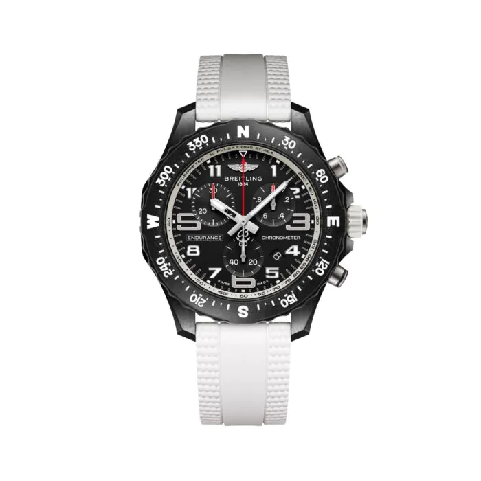 De Endurance Pro is verkrijgbaar in 44 of 38 mm voor atleten. Met een groot aantal kleurrijke wijzerplaten en rubberen banden, allemaal voorzien van een gesp. De twee maten worden respectievelijk aangedreven door Breitling’s Calibre 82 en 83, beide COSC-gecertificeerde SuperQuartz-chronografen die uitzonderlijke precisie leveren.