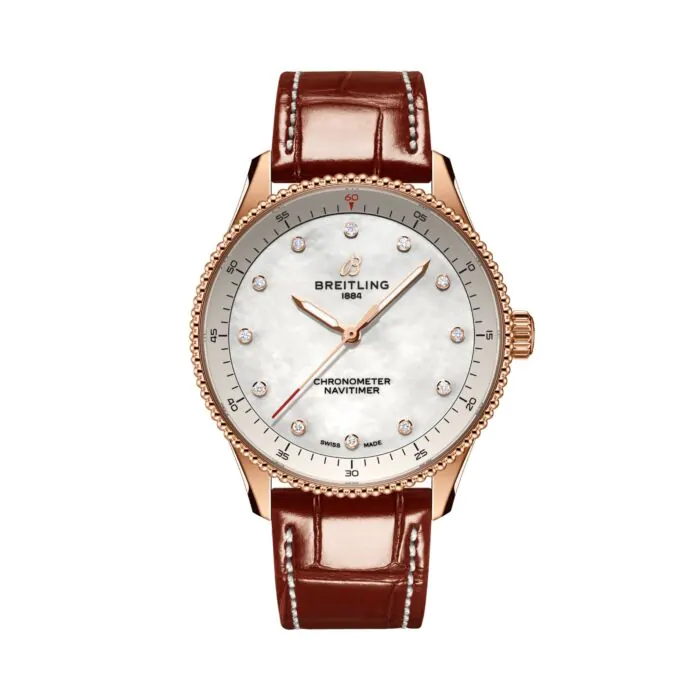 rekenliniaal die de Navitimer zijn onmiskenbare uiterlijk geeft, heeft de oogverblindende 32 mm-variant de rekenliniaal achterwege gelaten ten gunste van een vereenvoudigd wijzerplaatontwerp dat past bij de slanke diameter.