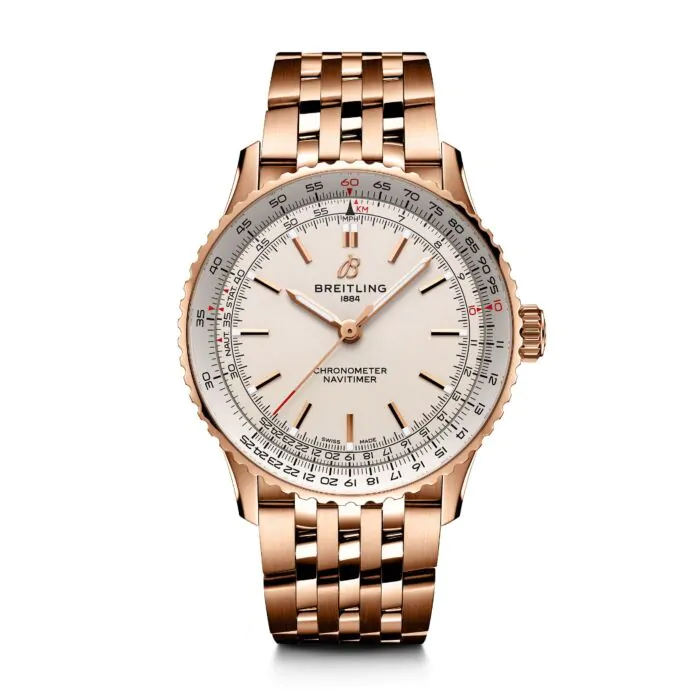 De Navitimer Automatic en Automatic GMT 41 spiegelt het iconische uiterlijk af, waarbij de chronograaf wordt weggelaten en toch een uitgebalanceerde wijzerplaatcompositie blijft behouden. De centrale plaatsing van de 24-uursschaal op de GMT en de strakke wijzerplaat van de Automatic zorgen ervoor dat de ingewikkelde rekenliniaal opvalt en tegelijkertijd de algehele esthetiek wordt gestroomlijnd.