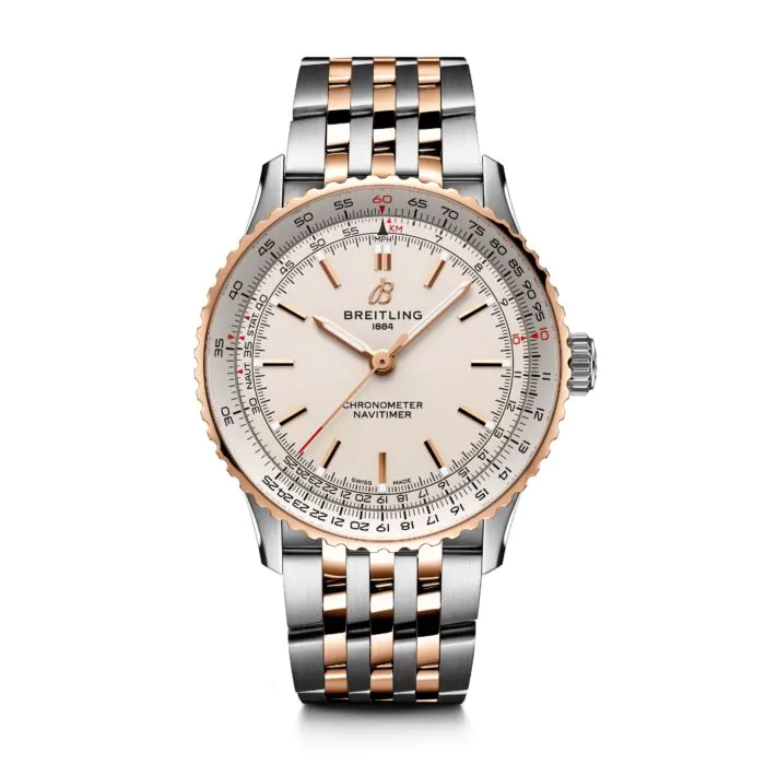 De Navitimer Automatic en Automatic GMT 41 spiegelt het iconische uiterlijk af, waarbij de chronograaf wordt weggelaten en toch een uitgebalanceerde wijzerplaatcompositie blijft behouden. De centrale plaatsing van de 24-uursschaal op de GMT en de strakke wijzerplaat van de Automatic zorgen ervoor dat de ingewikkelde rekenliniaal opvalt en tegelijkertijd de algehele esthetiek wordt gestroomlijnd.