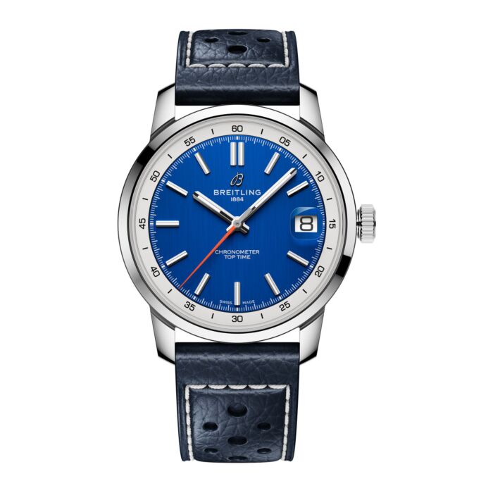 De Top Time B31 markeert het debuut van Breitling's B31 uurwerk met drie wijzers en datumaanduiding. Dit door Breitling geproduceerde uurwerk is uitgerust met een gangreserve van 70 uur en een garantie van 5 jaar. De retro geïnspireerde kast en wijzerplaat doen je denken aan dashboard klokjes van klassieke auto's uit een gouden tijdperk. Deze modellen zijn leverbaar op een stalen of leren band, en met een diameter van 38mm zijn deze horloges geschikt voor elke pols.