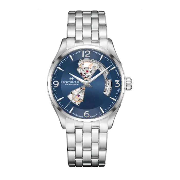 Via de deels opengewerkte wijzerplaat van deze Hamilton Jazzmaster zijn de belangrijkste ondelen van het automatische H-10 uurwerk te zien. Dit uurwerk heeft een gangreserve van 80 uur.