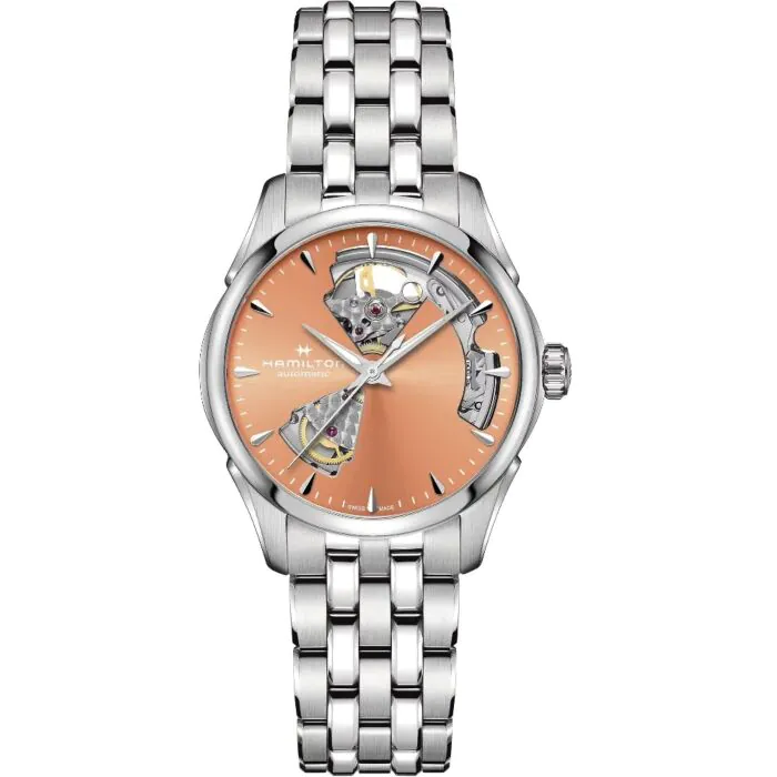 Via de deels opengewerkte wijzerplaat van deze Hamilton Jazzmaster zijn de belangrijkste ondelen van het automatische H-10 uurwerk te zien. Dit uurwerk heeft een gangreserve van 80 uur.