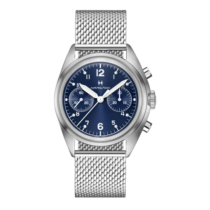 De KhakiPilot Pioneer Mechanical Chronograph is robuust, betrouwbaar en brengt hulde aan de vintage militaire luchtvaarthorloges van Hamilton. Dit horloge wordt aangedreven door het exclusieve handmatig opwindbare H-51-Si uurwerk, heeft een gangreserve van 60 uur en een prachtige wijzerplaat in de kleur Aviation Blue met een sunray finish.