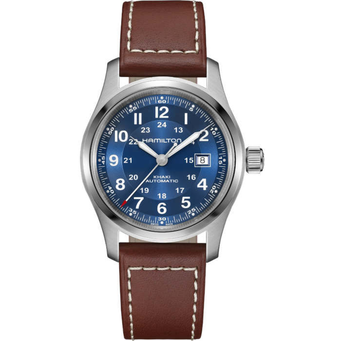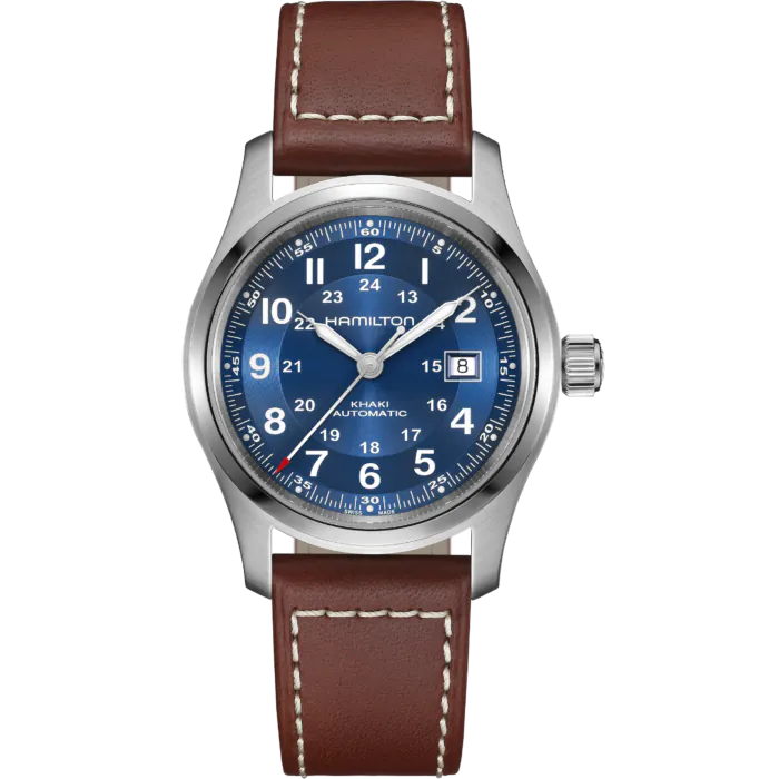 De Hamilton Khaki Field is met zijn robuuste uiterlijk geschikt voor avonturiers binnen en buiten de stad. De Khaki Field collectie omvat klassieke horloges in legerstijl uiterlijk. Dit model komt met een vernieuwende blauwe wijzerplaat.