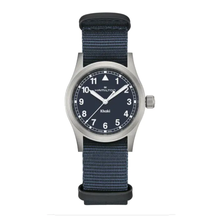 De Khaki Field Quartz geeft uitdrukking aan een terugkeer naar Hamiltons militaire erfgoed via eenvoud in het design. De wijzerplaat is voorzien van een heldere typografie, met rechtere Arabische cijfers en een minutenring met spoormotief. Het kleurenpalet is ingetogen, met een slanke zwarte wijzerplaat die geaccentueerd wordt door uurmarkeringen van Super-LumiNova® in de kleur oud radium. Het horloge wordt gecombineerd met een NATO-band van groen textiel en lussen van bruin leer - perfect voor uw volgende avontuur in het veld.