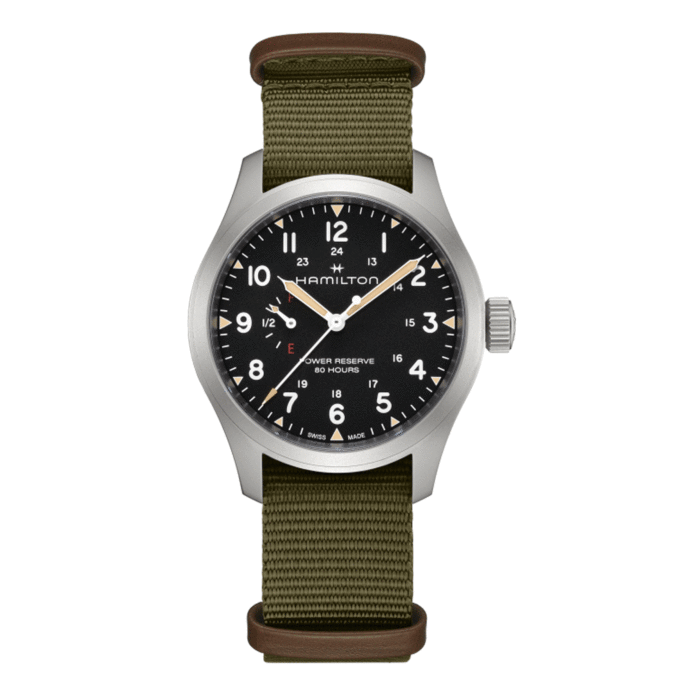 De Khaki Field Mechanical Power Reserve 40mm houdt het historische ontwerp en de essentiële functionaliteit van de Khaki familie in ere. Met het nieuwe handmatig opwindbare H-23 uurwerk, dat exclusief voor Hamilton ontworpen door ETA, is de gangreserve van 80 uur (voor het eerst) rechtstreeks op de wijzerplaat af te lezen. Uitgerust met een stevige groene NATO-band, geeft de witte wijzerplaat trots de vermelding ‘gangreserve 80 uur’ weer, samen met de aanduidingen ‘F’ (vol) en ‘E’ (leeg), om dit uitzonderlijke en functionele kenmerk te benadrukken.