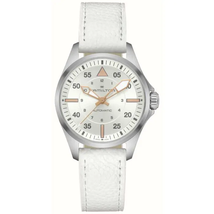 De Khaki Pilot Auto is speciaal ontworpen met het oog op ware luchtvaartliefhebbers, als een herinnering aan het verkennende en avontuurlijke karakter van de Khaki. De 36 mm-versies, aangedreven door het H-10 automatische uurwerk met een gangreserve van 80 uur en een Nivachron™-balansveer, sluiten aan bij de trend van kleinere horloges. Hoewel ze voldoen aan de eisen op het gebied van precisie voor de cockpit, lenen deze compactere ontwerpen zich perfect voor het leven in de lucht én op het vasteland. De Khaki Pilot Auto combineert een tijdloze roestvrijstalen band met een nachtblauwe wijzerplaat en een speciale Super-LumiNova-coating voor betere afleesbaarheid.