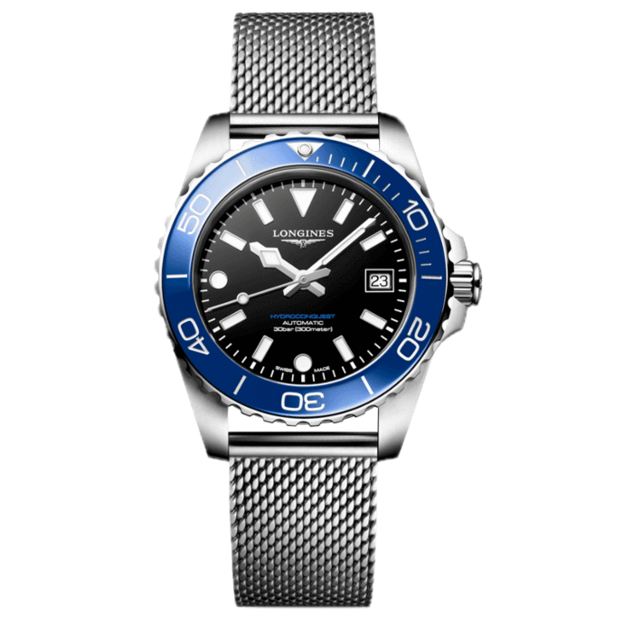 De HYDROCONQUEST-collectie combineert moderne esthetiek met bewezen prestaties. Aangedreven door een exclusief LONGINES automatisch uurwerk, waterbestendig tot 30 bar (300 m), met een eenzijdig draaibare bezel, een geschroefde kroon en een geschroefde kastachterkant.