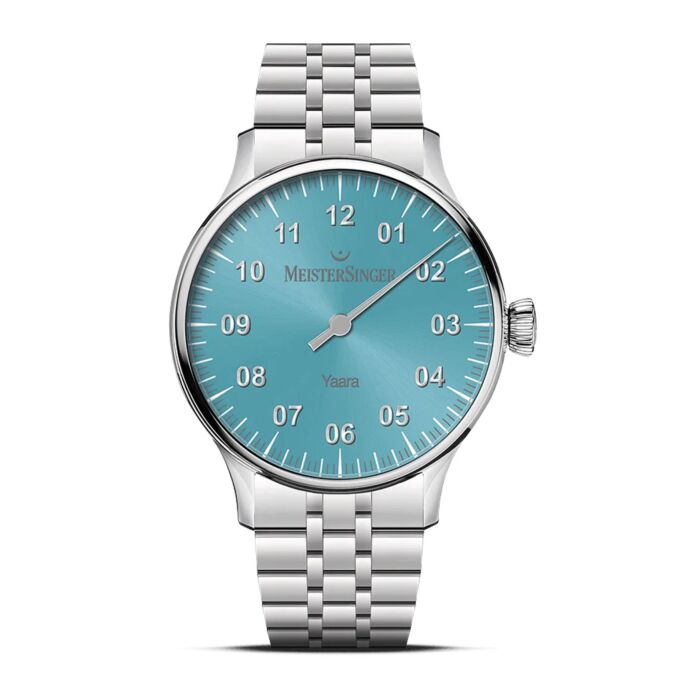 In deze versie heeft de Yaara een ijsblauwe sunray wijzerplaat waarop het licht zachtjes glinstert. De tweecijferige uuraanduiding, aangebracht in zilver, en de glanzende zilverkleurige wijzer geven het horloge een bijzondere glans. De fijne 5-minutenlijnen op de rand van de wijzerplaat verdwijnen naar de achtergrond op de Yaara voor nog meer helderheid.