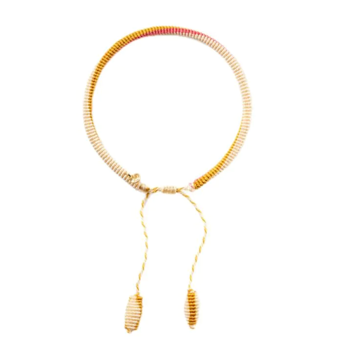 Deze Life armband in de kleur Honey is gevlochten met negen handgeknoopte strengen, elk vervaardigd van zes handgeverfde nylondraden en afgewerkt met een subtiel 18krt gouden label. Het ontwerp heeft een verstelbare schuifknoop voor een comfortabele pasvorm, waarbij de strengen eindigen in een mooi vervaardigde eindknoop.