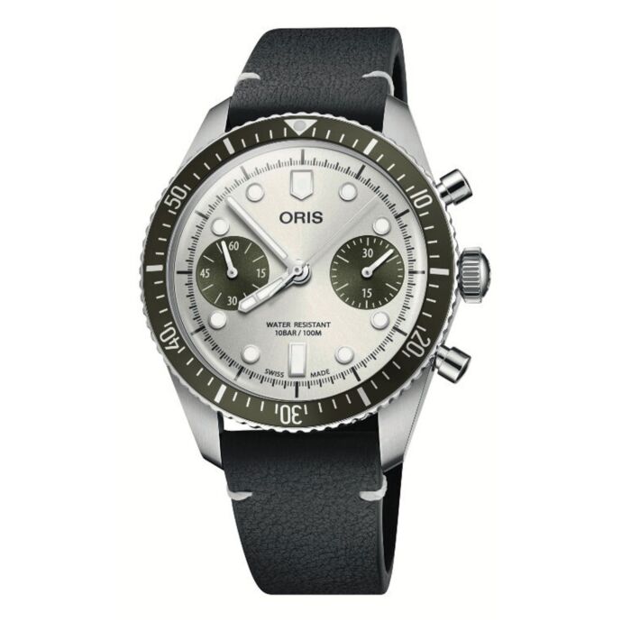 De oceaangroene details en de zilverkleurige sunray-wijzerplaat geven de neo-vintage Divers Sixty-Five Chronograph een strakke, verfijnde uitstraling. Retro accenten zoals de pompkroonknoppen worden ondersteund door het Oris Calibre 771 – een automatisch chronograafuurwerk met een gangreserve van 62 uur.