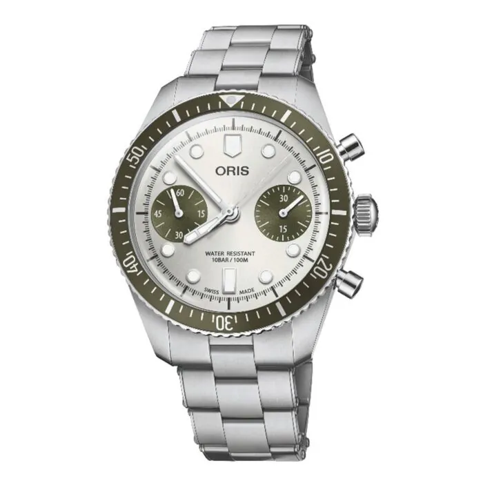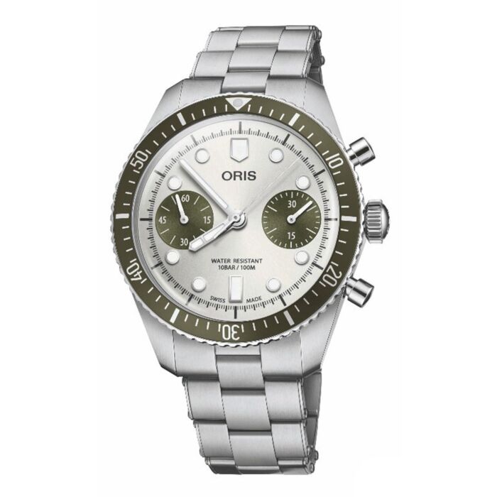 De oceaangroene details en de zilverkleurige sunray-wijzerplaat geven de neo-vintage Divers Sixty-Five Chronograph een strakke, verfijnde uitstraling. Retro accenten zoals de pompkroonknoppen worden ondersteund door het Oris Calibre 771 – een automatisch chronograafuurwerk met een gangreserve van 62 uur.
