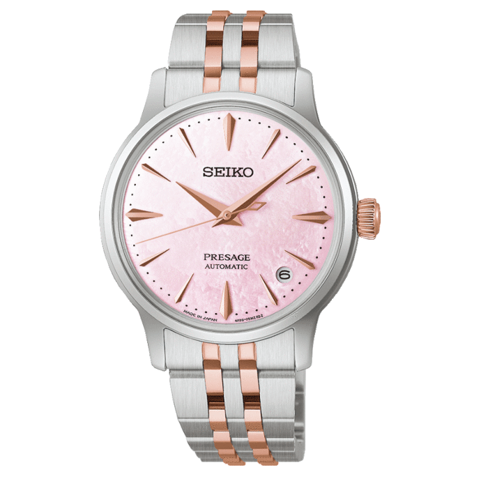 Deze seiko presage is een limited edition dameshorloge waarvan er maar 9000 van zijn gemaakt. Het horloge heeft een roze, parelmoerkleurige wijzerplaat en een staal-roségoud kleurige band.