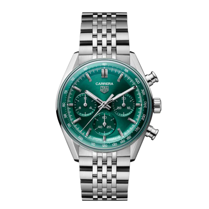 Met zijn betoverende groene, cirkelvormig geborstelde wijzerplaat combineert deze 41 mm TAG Heuer Carrera Chronograph een opvallende aanwezigheid met een verfijnde balans. Een eerbetoon aan precisie en prestaties, het belichaamt de geest van de autosport in een tijdloos, veelzijdig ontwerp, aangedreven door het eigen automatische Kaliber TH20-01.
