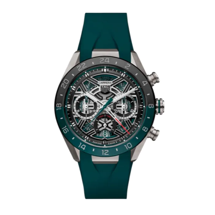 De TAG Heuer Carrera Chronograph, een bewijs van de spanning van de autosport. Met zijn gedurfde ontwerp en blauwe accenten weerspiegelt de geskeletteerde wijzerplaat van dit uurwerk de essentie van snelheid en innovatie. Klaar om in stijl vooruit te brullen. Dit model is uitgerust met een GMT functie, om een extra tijdzone bij te houden. Dit wordt gedaan met de rode wijzer.