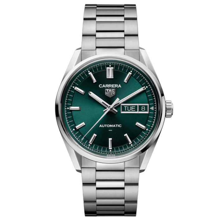 De nieuwste generatie van Carrera modellen! Dit zijn de eerste horloges die het nieuwe TH31-02 uurwerk dragen; een manufactuur uurwerk met dag-datum indicatie en een gangreserve van 80 uur. De groene sunray-geborstelde wijzerplaat valt op door zijn levendige toon, versterkt door rhodium-geplateerde wijzers en indexen. De licht gebogen flens voegt een verfijnde touch toe aan het tijdloze TAG Heuer Carrera-ontwerp. De symbolische Victory Wreath, gegraveerd op de achterkant van de kast, eert TAG Heuers motorsporterfenis en brengt hulde aan historische zegevierende racers die Carrera-tijdmeters dragen.