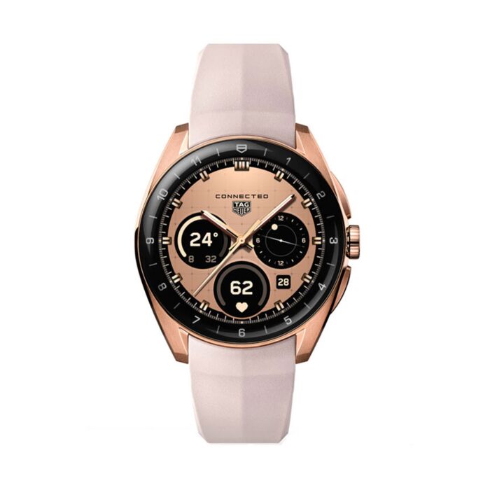 Elegantie ontmoet innovatie in de TAG Heuer Connected Calibre E5. Dit 40 mm model is voorzien van een verfijnde roségouden PVD roestvrijstalen kast en de volledig interne digitale ervaring van het Maison, aangevuld met sporttracking. Ervaar functioneel design en tijdloze stijl, perfect in balans.