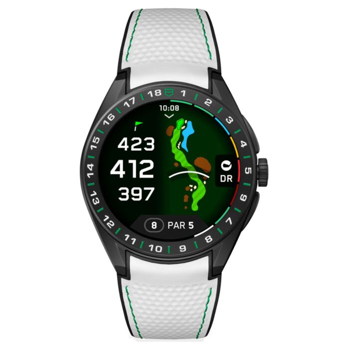 De TAG Heuer Connected Calibre E5 Golf Edition (45mm) is vervaardigd voor golfliefhebbers en balanceert stijl met sportgerichte precisie. De zwart zandgestraalde titanium kast met 18-hole lunette-gravures, plus de speciale golf-applicatie, maken dit een verfijnde metgezel voor elk spel. Dit model optimaliseert de golfbeleving met diepgaande tracking en aangepaste TAG Heuer-functies.