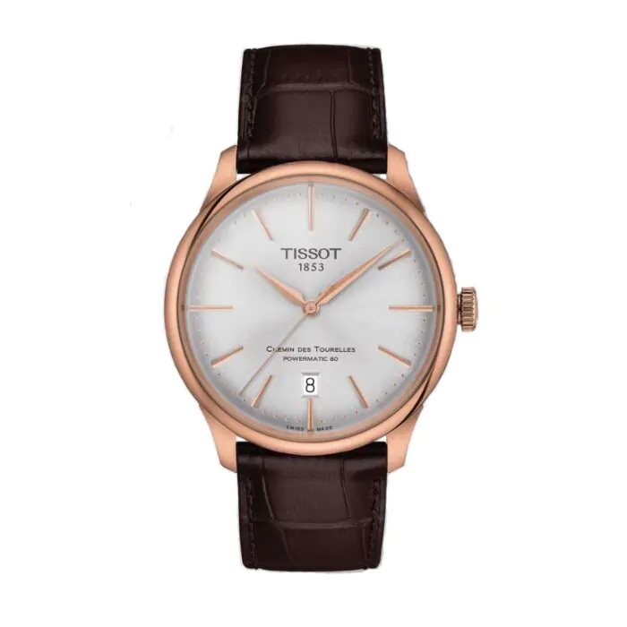 Tissot automatisch horloge met zilveren wijzerplaat en leren band.