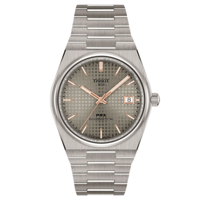 De PRX-lijn van tissot staat bekend om zijn moderne, tijdloze stijl en verfijnde afwerking. Na de 40mm en de 35mm is de PRX er nu ook in de tussenmaat, 38mm. Dit horloge heeft een titanium band en kast en is voorzien van het powermatic 80 uurwerk, die je aan de achterkant van het horloge kunt bewonderen dankzij het doorzichtige saffierglas. Verder heeft dit horloge een antreciet(donkergrijs)-kleurige wijzerplaat met een ruitjespatroon. De wijzers en indexen hebben een rose-goud kleurige toon, evenals de de randen van het datumvenster.