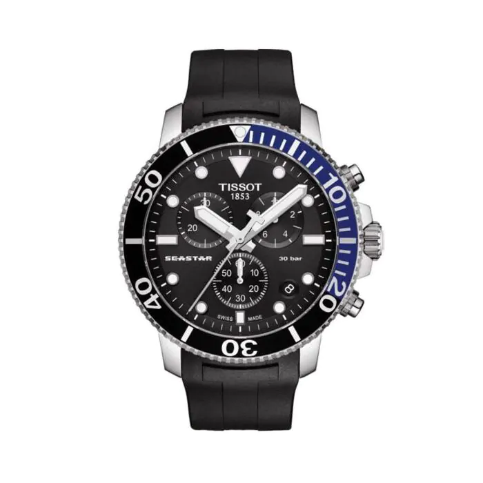 Duikuitrusting was nooit eerder zo volmaakt, zowel visueel als technisch. De Tissot Seastar 1000 Chronograph brengt stijl en prestatie samen zonder concessies te doen. Duiken is de inspiratie die vorm heeft gegeven aan dit horloge, zowel in de verschijning als in de functionaliteit. Het handhaaft zijn prestatie bij een druk van 30 bar (300 m/ 1.000 ft). Het bewijst dat passie voor onderwatersport en voorkeur voor de verfijnde Zwitserse techniek totaal compatibele buddies zijn. Het duikthema is voortdurend aanwezig door onderdelen zoals een in één richting draaibare lunette en de Super-LumiNova® wijzers en indexen. De Tissot Seastar 1000 Chronograph bewijst opnieuw het talent van Tissot voor het samenvoegen van voortreffelijke techniek in een verbluffend design.